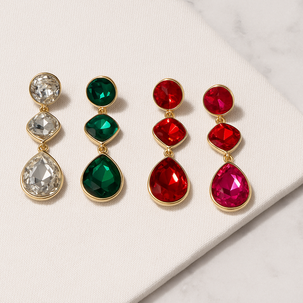 Make a dazzling entrance with these Triple Gemstone Drop Earrings, available in a range of vibrant colors. Each earring features three large, faceted crystal stones—round, square, and teardrop—arranged vertically for maximum sparkle and eye-catching movement. Whether you choose a fiery red or a bright fuchsia hue, these earrings are designed to turn heads and add a pop of glamour to any look.