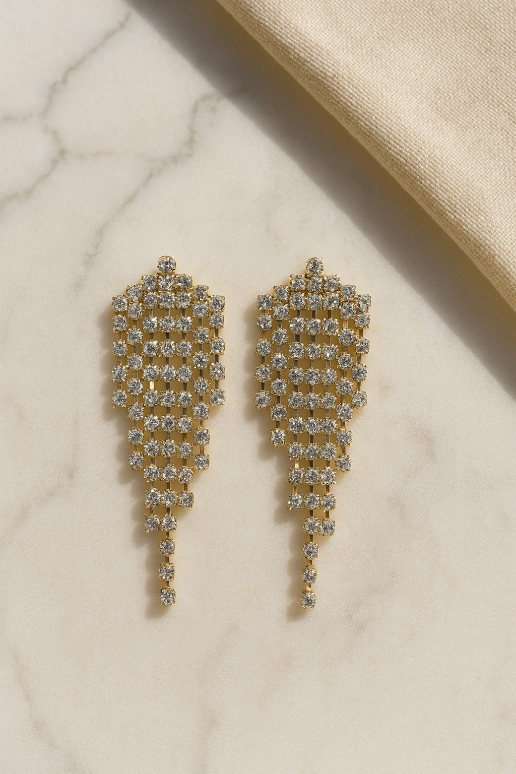 Crystal Fringe Drop Earrings – Tiered Grid Design with Iridescent Stones