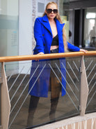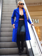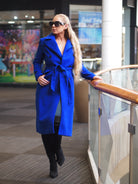 Stay warm in style this season with this elegant, timeless classic. This royal blue midi wrap coat features a belted waist, pockets, and chic designs, making it the perfect choice for any occasion. Stay fashionable and warm all winter long.