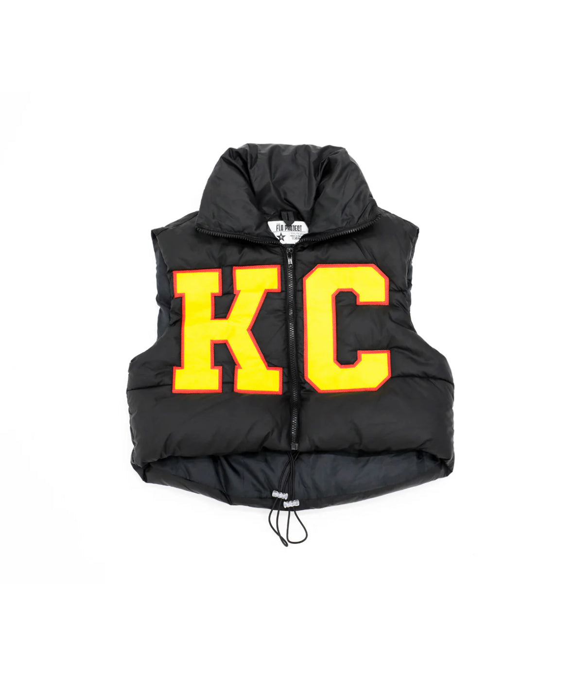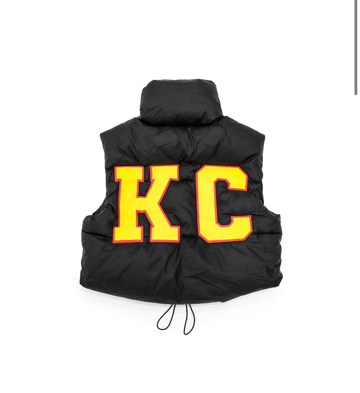Rep your city with pride in this KC cropped puffer vest, featuring bold varsity-style lettering across the front. Designed with cozy padding, a zip-up front, and an adjustable drawstring hem, it’s perfect for layering over hoodies or jerseys. Whether you’re tailgating, at the stadium, or repping your hometown around town, this vest brings the spirit.